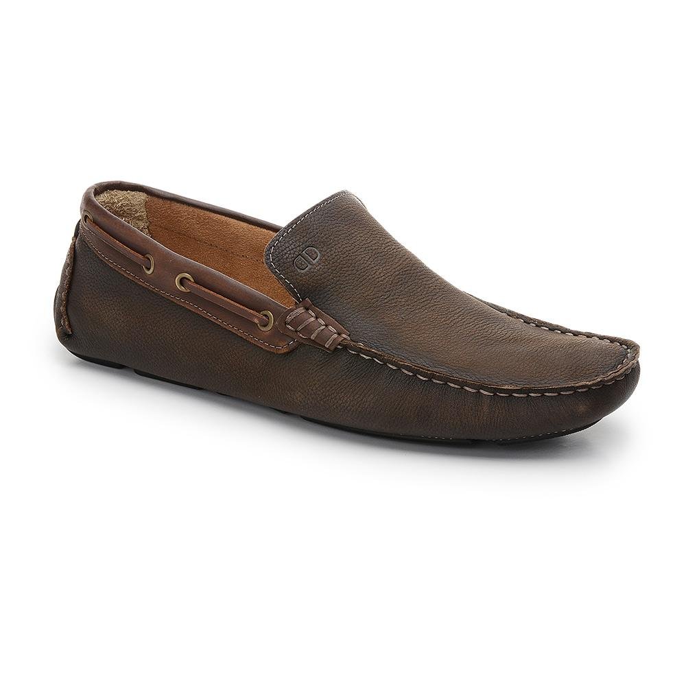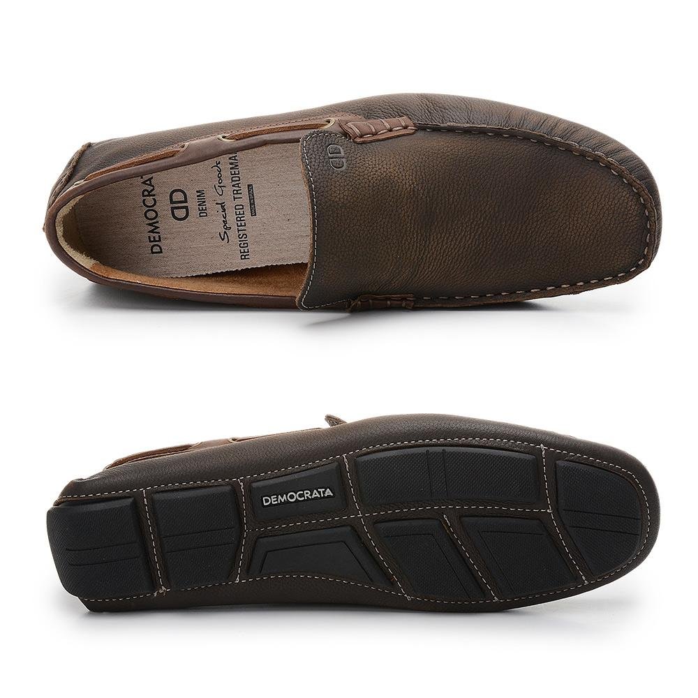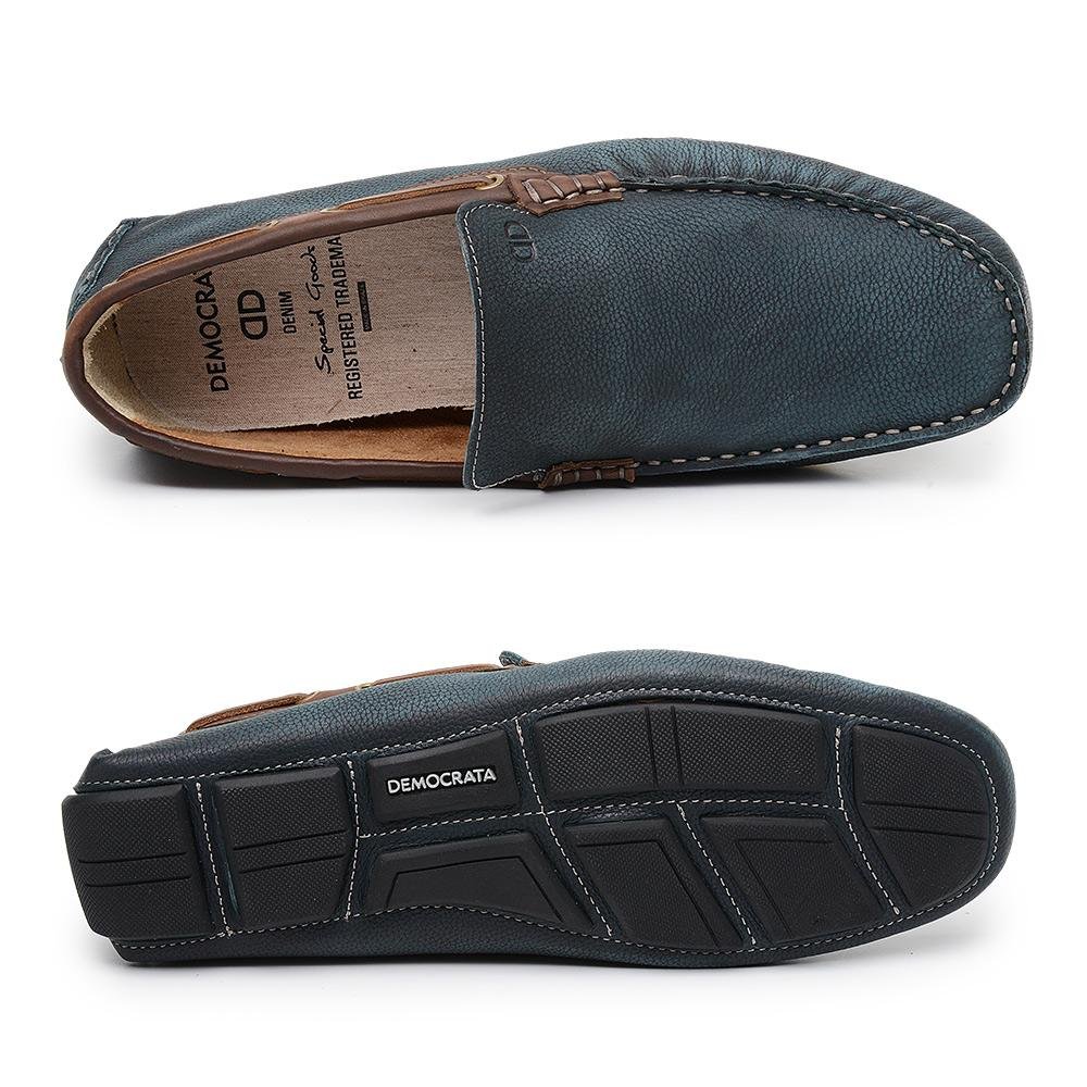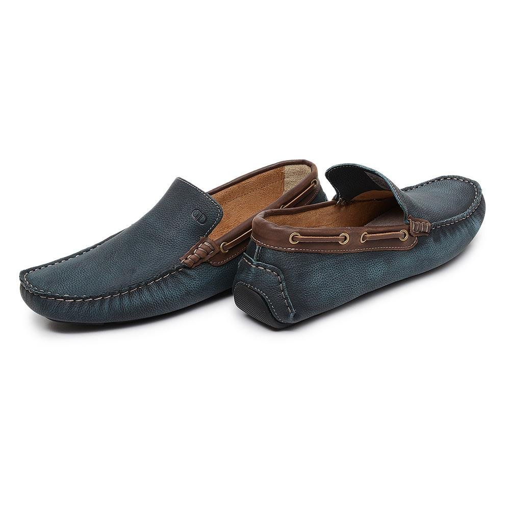 Mocassim confeccionado em couro na cor azul oceano, forrado na parte interna com couro e palmilha de tecido, solado de borracha aderente.